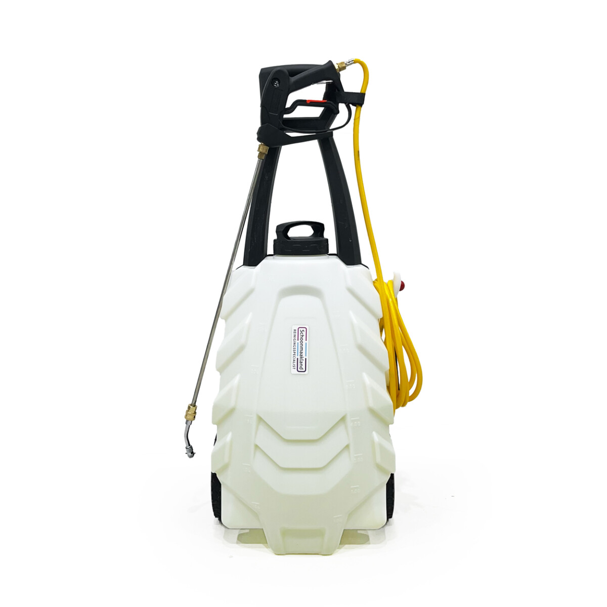 De robuuste 30-liter tank op wielen is uitgerust met een geïntegreerde membraanpomp, waardoor de sprayer moeiteloos mobiel inzetbaar is. Met een bereik van tot 13 meter ver en 10 meter hoog is deze sproeier ideaal voor diverse toepassingen. Dankzij de twee instelbare standen kan je eenvoudig schakelen tussen drukniveaus en vloeistofverbruik, afgestemd op jouw noden.